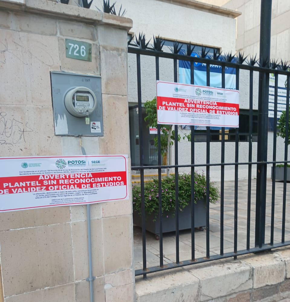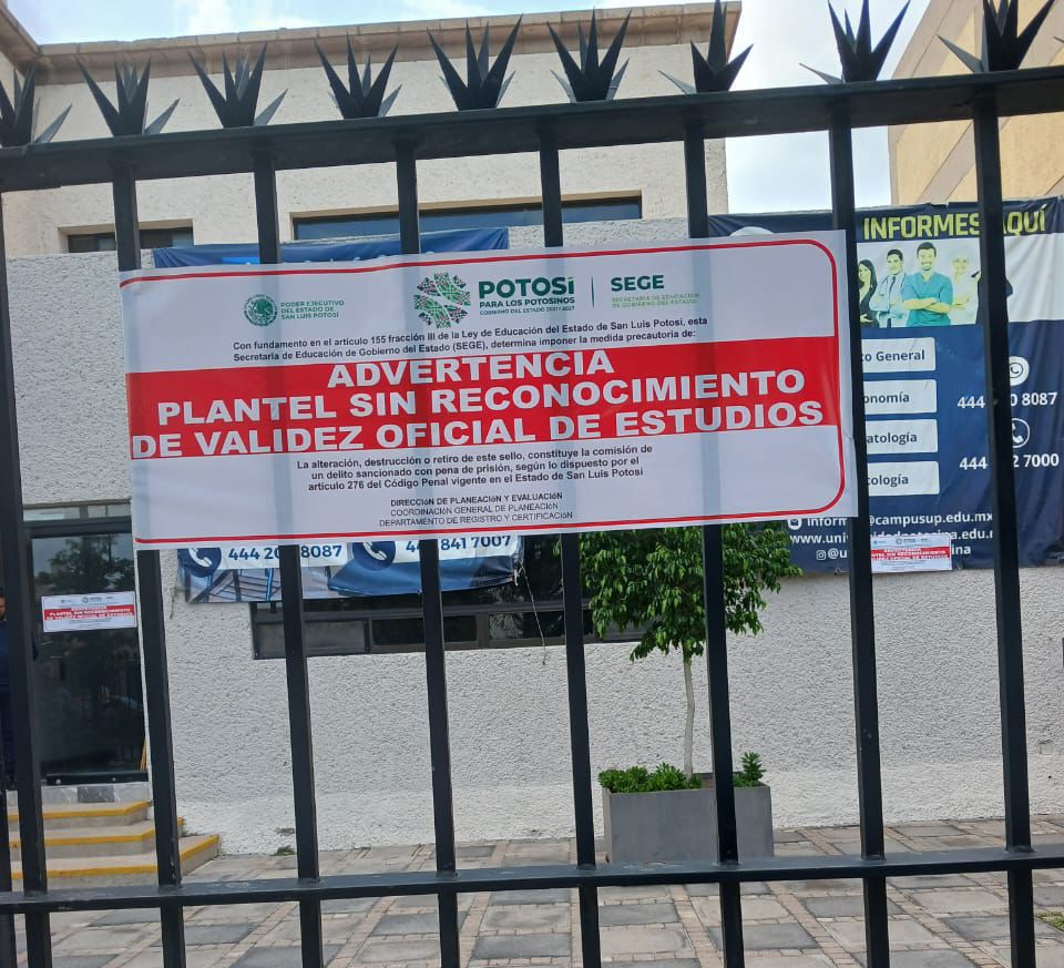 En seguimiento a la visita de vigilancia extraordinaria iniciada por el Poder Ejecutivo a través de la Secretaría de Educación de Gobierno del Estado (SEGE) en contra de la persona moral Universidad Potosina S.C., este jueves fueron colocados sellos de advertencia de que dicho plantel no cuenta con un Reconocimiento de Validez Oficial de Estudios (RVOE), que respaldara legalmente el publicitar e impartir estudios de nivel superior, de las carreras de Licenciatura en Médico General, Licenciatura en Gastronomía, Licenciatura en Estomatología y Licenciatura en Psicología.