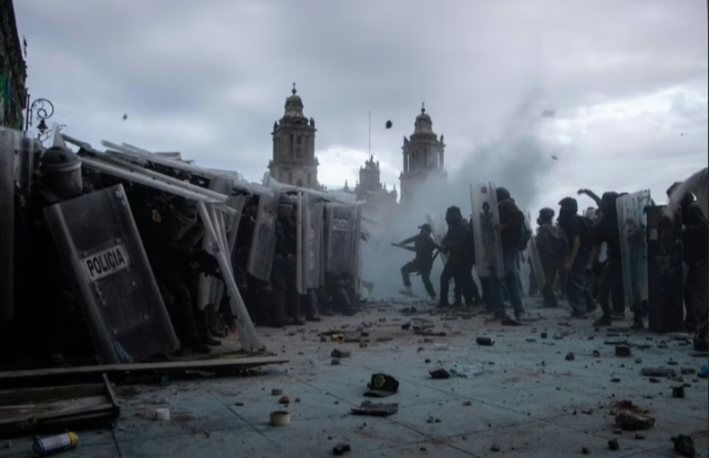 Las protestas en la capital mexicana, que lucía tapiada en su recorrido para protegerse de los daños, han ido evolucionando en su avance desde saqueos y algunas hogueras aisladas hasta enfrentamientos con las fuerzas del orden, que estaban equipadas con el uniforme antimotin3s y han respondido con gas lacrimóg3no.