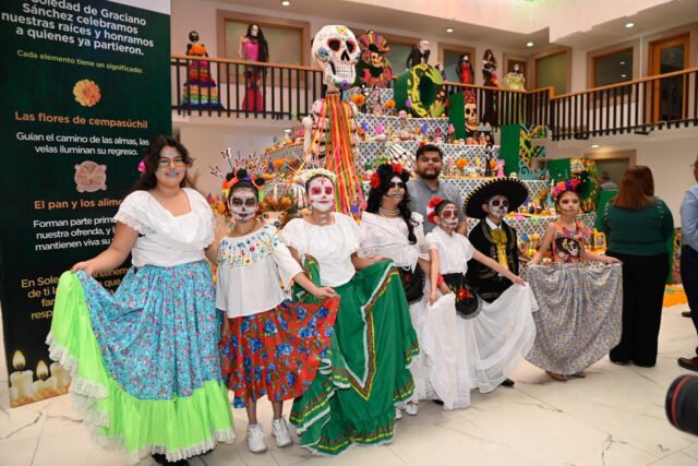Con entusiasmo y alegría, el primer Coro Infantil de la Escuela Municipal de Música engalanó la inauguración del Altar de Muertos Monumental instalado en el interior de la Presidencia Municipal; las y los pequeños ataviados como catrines y catrinas, interpretaron con emotividad los temas “Recuérdame”, “Un Poco Loco” y “El Mundo es mi Familia”, conquistando al público presente con su talento y simpatía.