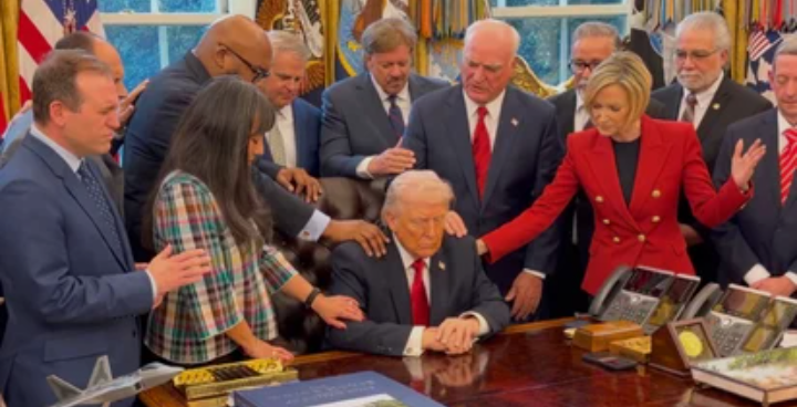 El jueves, líderes religiosos cristianos acudieron al Despacho Oval para realizar una oración en presencia del presidente Trump. El video, compartido por Dan Scavino en redes sociales, muestra a un pastor dirigiendo la reunión espiritual.