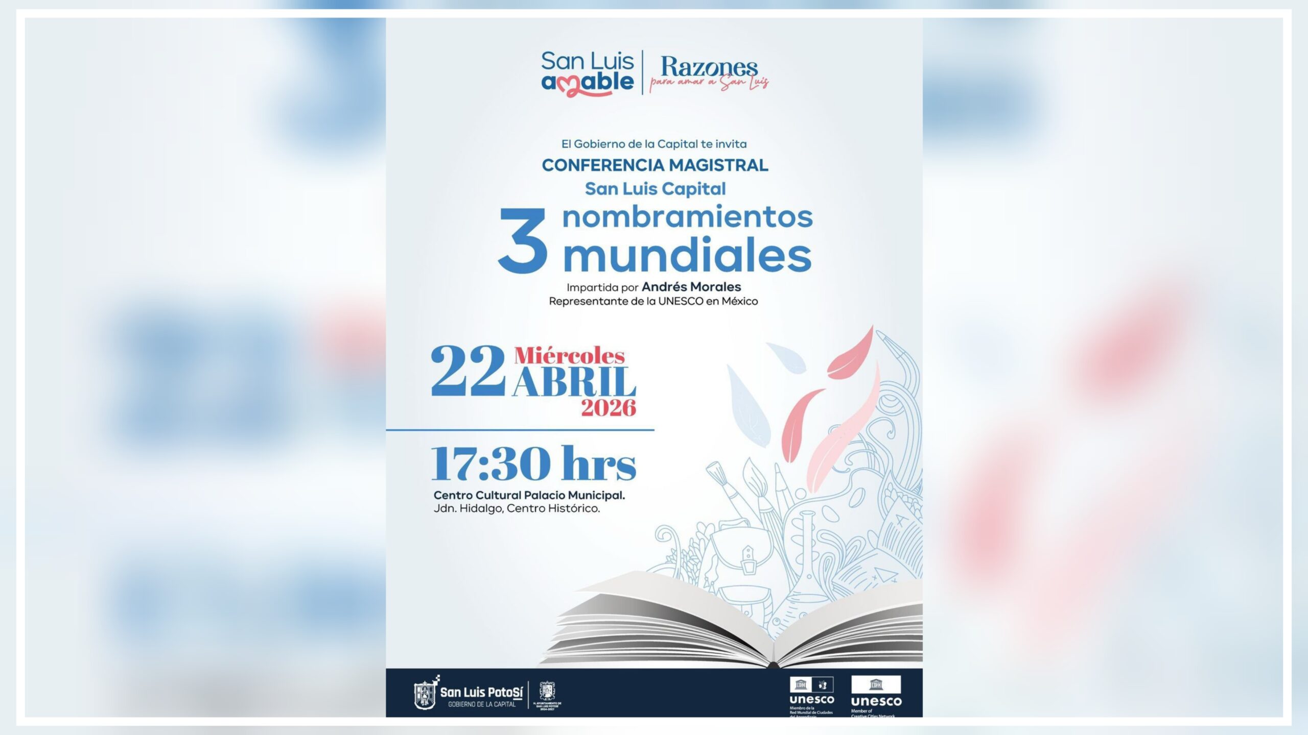 El Ayuntamiento de San Luis Capital invita a la ciudadanía a la conferencia magistral «San Luis Capital: 3 nombramientos mundiales», que será impartida por Andrés Morales, representante de la UNESCO en México, como parte de las acciones para fortalecer la proyección internacional de la ciudad.