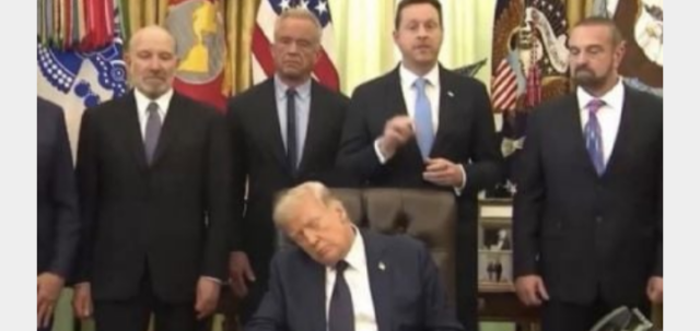 El presidente de Estados Unidos, Donald Trump, de 79 años, fue captado con los ojos cerrados durante un evento televisado en directo desde el Despacho Oval el pasado 23 de abril, mientras se anunciaban los precios de un medicamento.