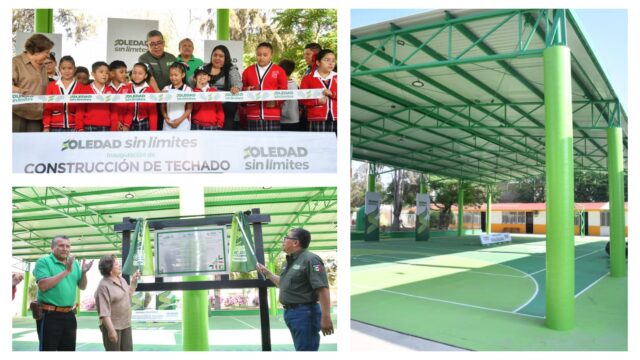 Juan Manuel Navarro Muñiz, Alcalde de Soledad de Graciano Sánchez, inauguró la construcción de un techado con cubierta metálica en la Escuela Primaria “José María Morelos y Pavón”, ubicada en la Unidad Habitacional Pavón, con una inversión estatal superior a los dos millones de pesos, en beneficio de más de 327 estudiantes; la obra, realizada en coordinación con el Gobierno del Estado, corresponde al techado con cubierta metálica de 15 por 27 metros, que incluye pintura de cancha, instalación de postes de voleibol, porterías multifuncionales y alumbrado, fortaleciendo espacios dignos para el desarrollo de niñas y niños, en apego a la visión de cercanía y atención a las familias.